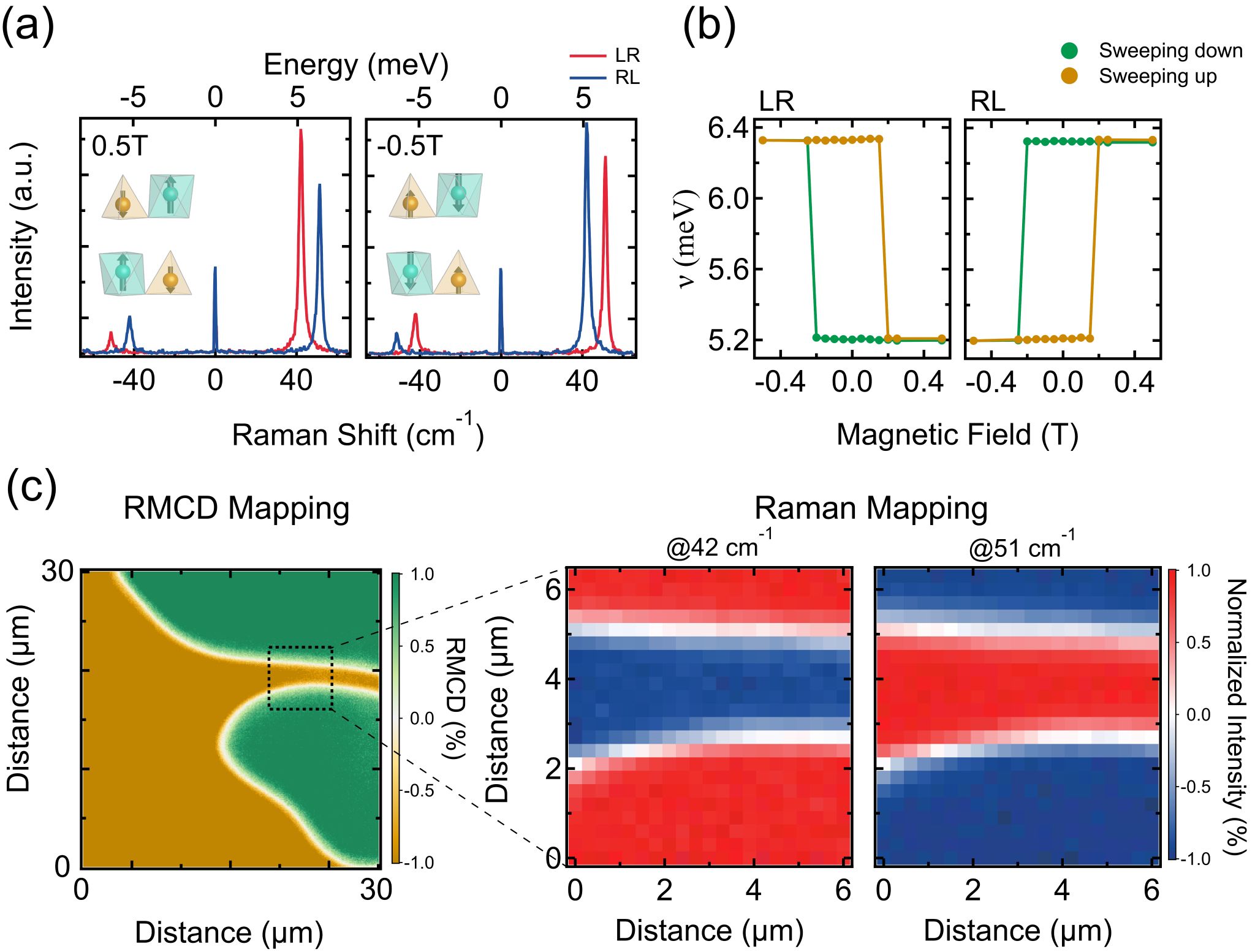 2a)磁场翻转手性声子角动量;(b)手性声子频率随外磁场的滞回效应;(c)左图: FZMO亚铁磁畴的显微磁光成像;右图:手性声子畴的拉曼光谱空间扫描成像。