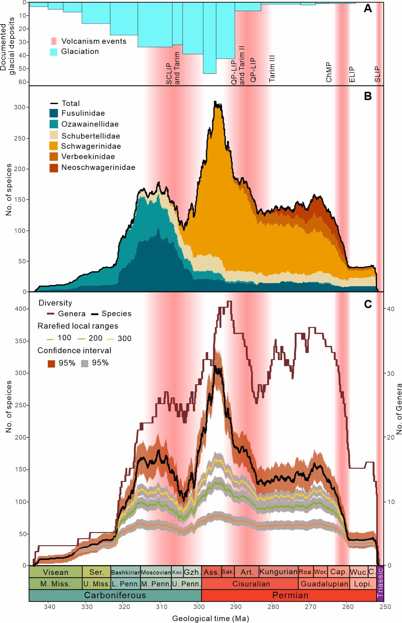 研究主角是一群叫做?类有孔虫(fusuline)的远古单细胞海洋生物,它们个体虽小,但数量惊人(图1),曾主宰海底世界,被誉为“碳酸盐岩工厂”。团队发现,9180多万年间,这些生物经历了两次“多样化爆发”和四次“灭绝危机”(图2)。尤其在2.6亿年前峨眉山大规模火山喷发前后,体型较大的?类几乎绝迹;而2.52亿年前的二叠纪末期超级火山事件,更彻底终结了这个庞大家族的演化历程。