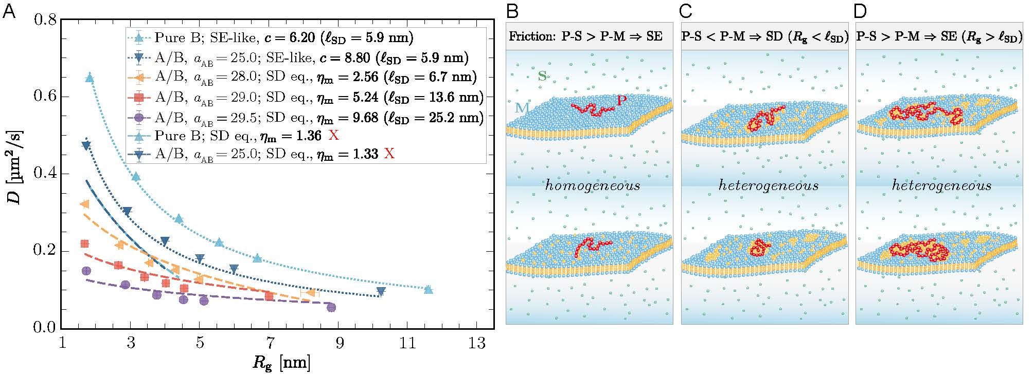 图 3:大尺度流体力学模拟揭示高分子在脂质膜上扩散的尺寸依赖性及相应的物理图像。