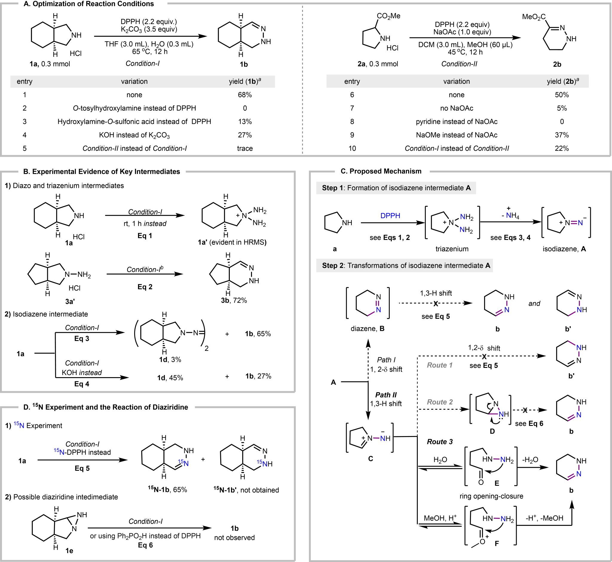 研究团队通过对反应进行系统性的条件筛选,确定了最佳反应条件:对于取代的吡咯烷底物顺式全氢异吲哚1a在条件(DPPH, K2CO3, THF/H2O, 65 °C, 12hr)下能以68%核磁收率得到插氮产物1b(图2A);后续通过关键中间体的监测、15N标记等实验巧妙地论证出了反应的机理(图2C)。