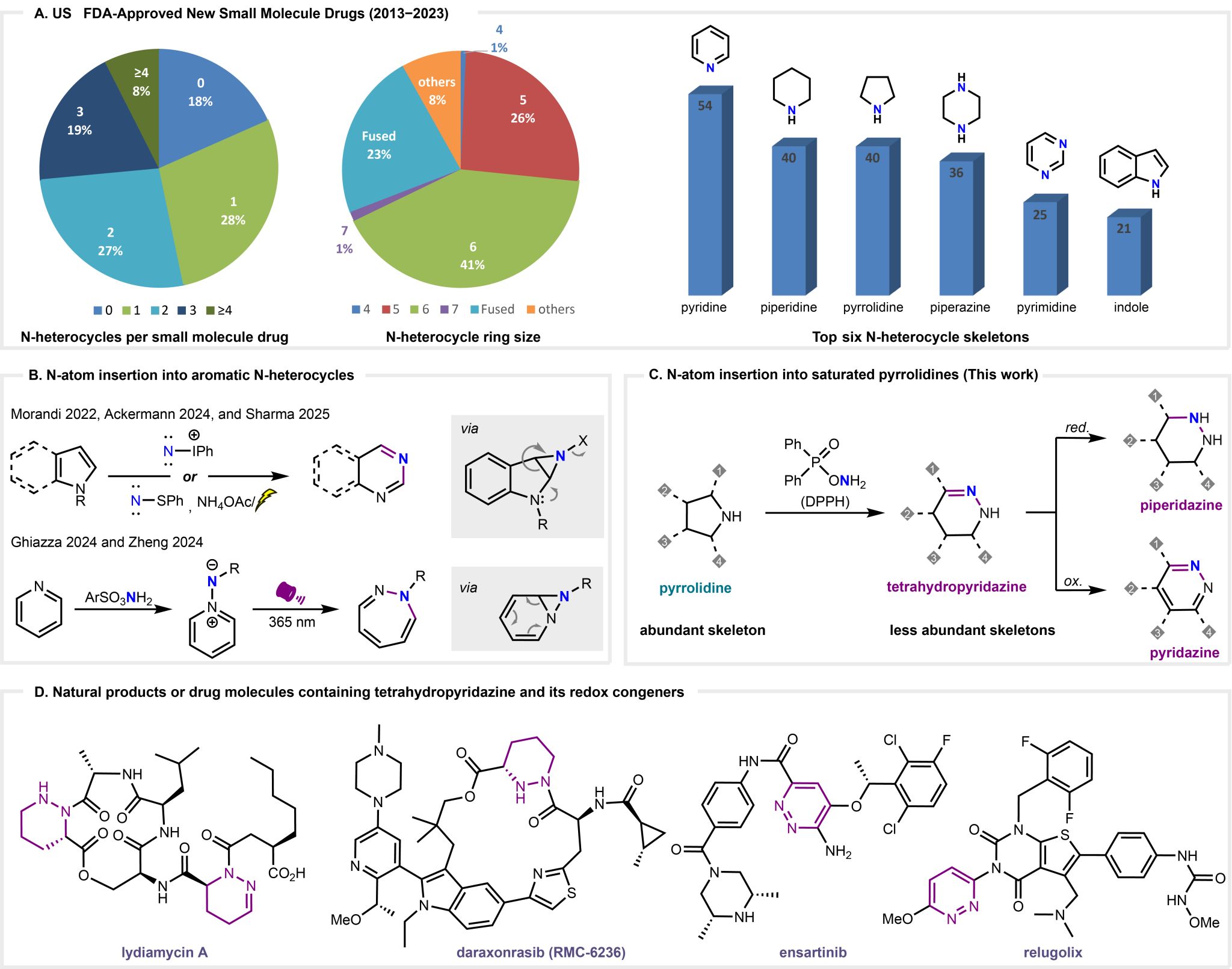 Fig. 1. N-Atom Insertion Strategies in N-Heterocycles. (A) US FDA-Approved new small molecule drugs (2013?2023). (B) N-atom insertion into aromatic N-heterocylces. (C) N-atom insertion into saturated pyrrolidines. (D) Natural products or drug molecules containing tetrahydropyridazine and its redox congeners.