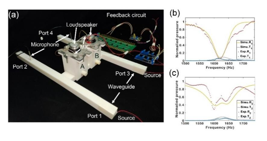 为了在声学体系中实现并加以实验验证,研究团队构建了基于声超构材料的非厄米散射系统,并创新性地利用反馈控制原理实现了对非厄米参数的精确解耦调控。如图2所示,本工作利用亚波长声学腔管模型建立双通道非厄米散射系统,该模型由两个相通的声谐振腔与矩形波导组合而成,可通过改变其结构参数来灵活调节各腔本征频率和腔间耦合强度。进一步,为实现对系统非厄米损耗的解耦调控,如图3(a)所示,通过引入反馈电路所构成的主动声学单元,能够在谐振腔内产生稳定可控的等效损耗,从而突破了传统静态波导体系中损耗难以解耦调制的瓶颈。为精准定量表征该反馈调控机制,研究团队还构建了全系统的电-声耦合有限元仿真和深度学习设计框架,为系统优化和实验参数确定提供了重要支撑。本工作所提出的反馈控制调制非厄米损耗策略为精准激发声相干完美吸收奇异点提供了必要条件,继而为深入研究非厄米声学系统中的奇异点物理提供了可靠的实验平台。