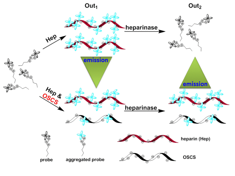 图2. 荧光探针TPE-1 用于肝素检测,并结合肝素酶处理用于肝素污染物多硫酸软骨素的检测原理示意图。