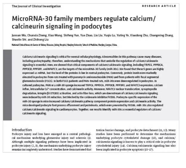 近期,凯发k8官网医学院院长刘志红院士带领的国家肾脏疾病临床研究中心团队在足细胞损伤修复机制研究方面取得重大进展。相关成果发表于国际著名医学杂志《J CLIN INVEST》。题目为:“MicroRNA-30 family members regulate calcium/calcineurin signaling in podocytes”。这是迄今为止,我国肾脏病领域独立完成的发表于JCI的第一篇论文。在这篇文章中,研究人员证实miR-30家族可以通过调控calcium/calcineurin信号通路,从而参与足细胞稳态和功能,miR-30家族表达下降导致足细胞发生损伤。这项研究从一个全新的角度阐明了足细胞损伤的新机制,为这类基本的治疗干预提供了新的靶点,是一项具有标志性的研究成果。