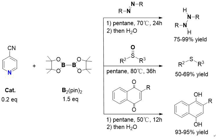 进一步,以4-氰基吡啶为催化剂,他们将这种新的活化模式成功地应用于偶氮类化合物中N=N双键的还原,亚砜的还原脱氧以及醌的还原等反应。