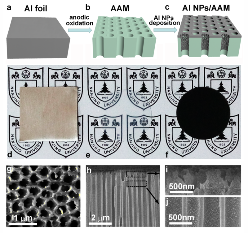 图2. 三维铝颗粒等离激元黑体自组装工艺与组装前后光学照片对比图