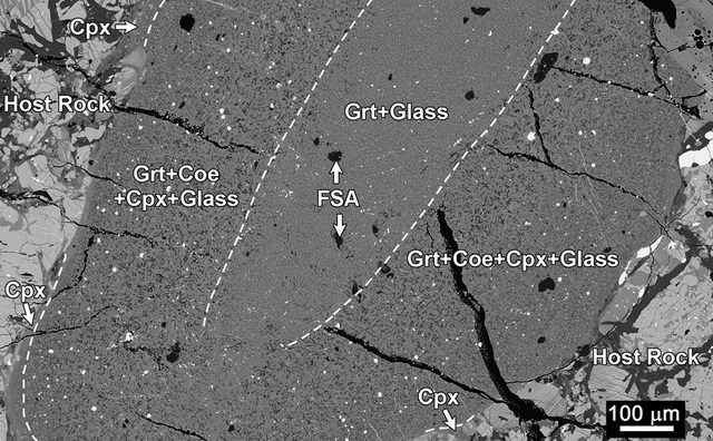 图1、由高压矿物组成的复杂冲击熔融脉
