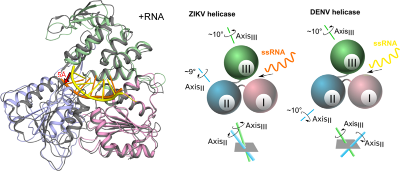 图注:寨卡病毒和登革热病毒的解旋酶以不同的“运动”方式结合自身的基因组