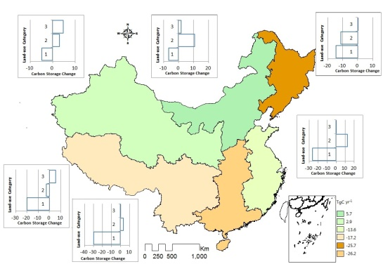 本研究是对该领域的进一步深化,研究中以1 km-Grid 土地利用栅格数据为基础,配合气候带类型图、植被分布图和土壤类型等辅助图层、以及大量国内陆地生态系统碳循环的研究参数成果、并借鉴2006IPCC(Intergovernmental Panel on Climate Change)清单中主要土地利用类型(农田、草地、森林)不同管理方式下碳储量变化影响因子,首次综合评价了近20年来中国土地利用类型变化及土地管理方式变化对陆地生态系统碳储量的影响。研究发现,1990-2010年期间,土地利用类型及管理方式变化共造成我国陆地生态系统1.45PgC T 的碳储量损失。其中,土地利用类型变化使我国植被碳储量增加了13.2TgC yr-1,而土壤有机碳含量减少了11.5TgC yr-1;土地利用方式转变尤其是建设用地的快速增长共造成101.8TgC yr-1的碳损失。该研究对我国陆地生态系统碳平衡进行了全面检验,能为转变土地利用方式,促进低碳发展提供决策参考和技术支撑。