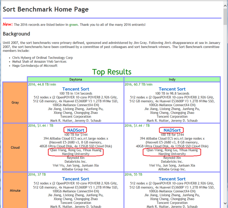2016年11月10日,有“计算界奥运会”之称的国际著名Sort Benchmark 全球数据排序大赛(http://sortbenchmark.org/),官网公布了2016年全球大数据排序性能评测大赛结果。凯发k8官网计算机科学与技术系PASA大数据实验室(http://pasa-bigdata.www.iyefoo.com)联合阿里巴巴和美国Databricks公司组成的参赛团队NADSort,经过几个月的深度研究和持续努力,击败了多个世界级参赛团队,刷新了大赛之前的世界纪录,荣获2016年CloudSort大数据排序世界冠军。