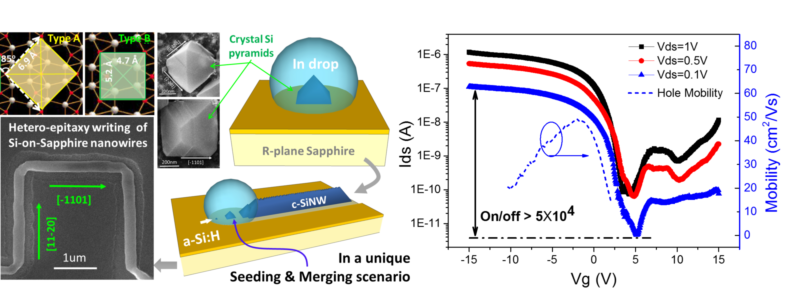 在异质衬底上外延生长晶硅薄膜层是高性能空间电子、面向移动通讯和微波电子器件的关键核心技术。同时,基于绝缘衬底上的高品质晶硅薄层(即silicon-on-insulator, SOI结构)可以大幅降低高速电子器件中电路与衬底之间的寄生电容,从而获得更高的操作速度和更低的功耗。另外,使用绝缘的衬底还能直接省略传统CMOS器件中的隔离区,从而大大提高器件的集成度。基于以上考虑,在R-plane蓝宝石衬底上生长晶硅外延层(即silicon-on-sapphire,SoS)技术,一直以来,在各种极端高性能条件下的电子器件以及高功率通讯领域具有非常重要的应用。然而,传统的SoS制备工艺需要高温(>900 oC)的CVD淀积和退火再晶化工艺。由于晶硅和蓝宝石衬底之间具有较大的热膨胀系数适配(晶硅的仅为蓝宝石的二分之一),高温制备工艺后的冷却过程中会引入大量的晶格缺陷,从而严重地限制了SoS的大规模可靠制备。由于大多数SoS电子器件,以及基于SoS制备的近-中红外光波导等,最终需要的仅仅是准一维硅纳米沟道结构,所以从工艺流程的角度看,也需要研发一种“一步到位”的纳米线沟道直写技术,从而规避受应力和晶格适配限制制约的传统“平面-刻蚀-纳米沟道”SoS技术工艺挑战。