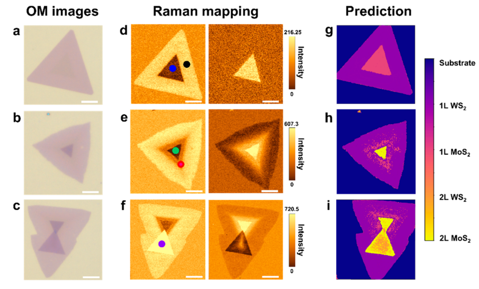 图3 MoS2/WS2异质结的拉曼光谱和人工神经网络表征。 (a)-(c)异质结的OM图片;(d)-(f)异质结的拉曼平面扫描图;(g)-(i)识别结果。标尺10微米