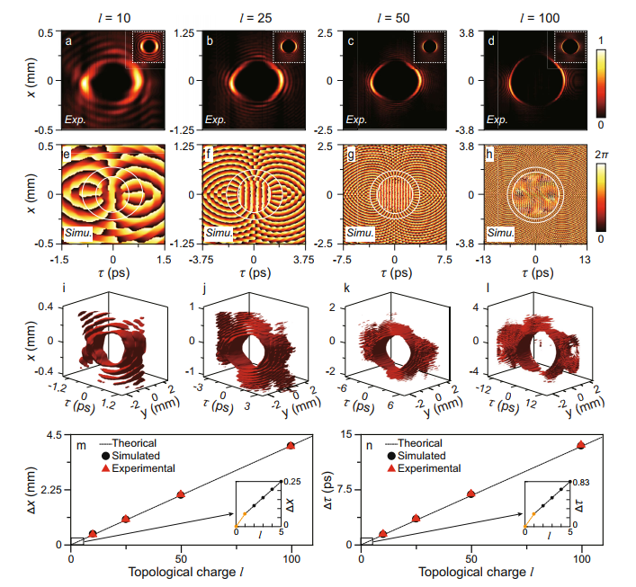 图3. 拓扑荷l为10, 25,50和100 的时空贝塞尔涡旋的实验与仿真结果。