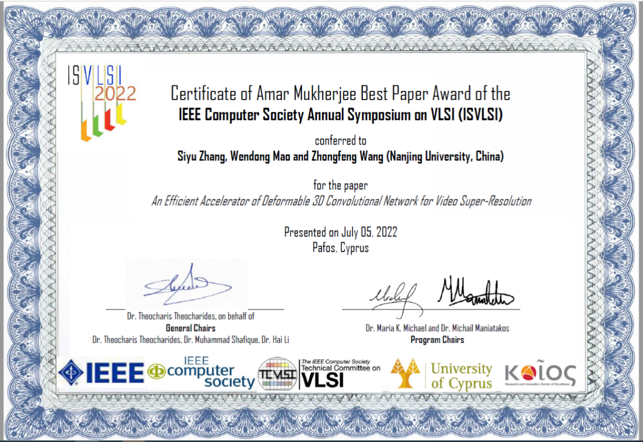 2022年7月4至6日,IEEE计算机学会超大规模集成电路(简称VLSI)年度研讨会(ISVLSI, http://www.eng.ucy.ac.cy/theocharides/isvlsi22/) 在塞浦路斯的帕福斯举行。凯发k8官网电子科学与工程学院王中风教授团队的论文"An Efficient Accelerator of Deformable 3D Convolutional Network for Video Super-Resolution"(作者:张思雨,毛文东,王中风), 从近200篇文章中脱颖而出,最终获得大会颁发的"最佳论文奖"。自2019年ISVLSI会议以来,这是王教授团队第二次荣获该年会的最佳论文奖,也是其团队在近三年内第五次在IEEE集成电路相关领域的国际学术会议上荣获最佳论文奖。