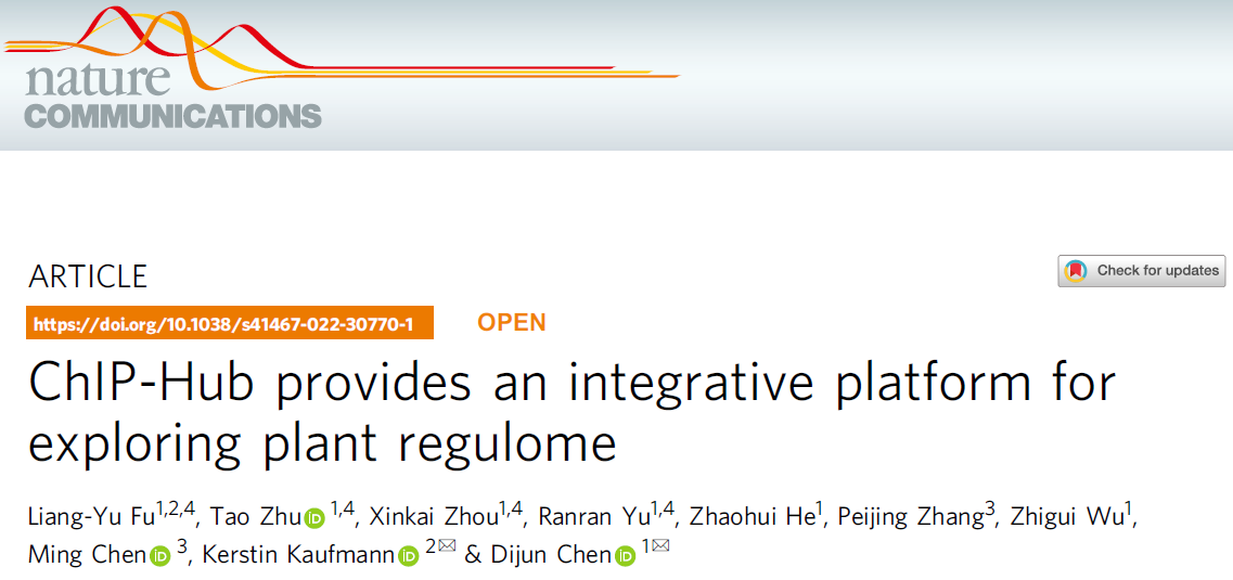 该研究成果于2022年6月14日以题为ChIP-Hub provides an integrative platform for exploring plant regulome的研究论文在Nature Communications在线发表,并且被杂志选为Editors’ Highlights文章。生命科学学院陈迪俊副教授为最后通讯作者,德国柏林洪堡大学Kerstin Kaufmann教授为共同通讯作者。生命科学学院傅靓彧,博士研究生祝涛,硕士研究生周欣恺和于冉冉为该论文的共同第一作者。浙江大学生命科学学院陈铭教授和张霈婧博士对本研究亦有贡献。本研究得到了国家自然科学基金和凯发k8官网登峰人才支持计划的资助。作者特别感谢凯发k8官网高性能计算中心为本研究提供了宝贵的高性能计算(HPC)资源,凯发k8官网信息中心为本研究提供了技术支持。