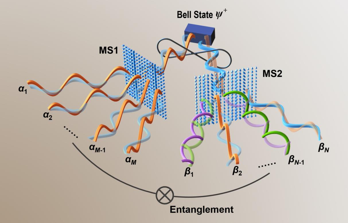 图1 基于几何标度相位的介质型超构表面实现量子纠缠态的多通道转化和分发的示意图。