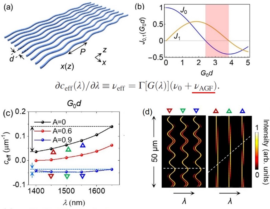 研究人员以常见的正弦弯曲的波导为例演示了这种无色散耦合现象,如图2所示。正弦弯曲的波导的等效耦合系数(ceff)可以用贝塞尔函数(J0),可以有正、负及零耦合的调制。而考察耦合系数随着波长变化时,研究发现除了传统直波导色散项(图2公式右面0项)外,多了一项人工规范场AGF项(红线标注项),经过推导该项与贝塞尔函数的系数比值有关(J1/J0),当二者反号时(图二(b)红色区域)有望与第一项抵消,从而获得无色散耦合。图2(c)展示了通过参数调节构建的零色散效果(A=0.9)。图2(d)则对比了不同波长下弯曲波导无色散的耦合与直波导耦合色散效应的理论计算结果,人工规范场设计的弯曲波导耦合长度完全保持不变,展示了其宽带工作特性。
