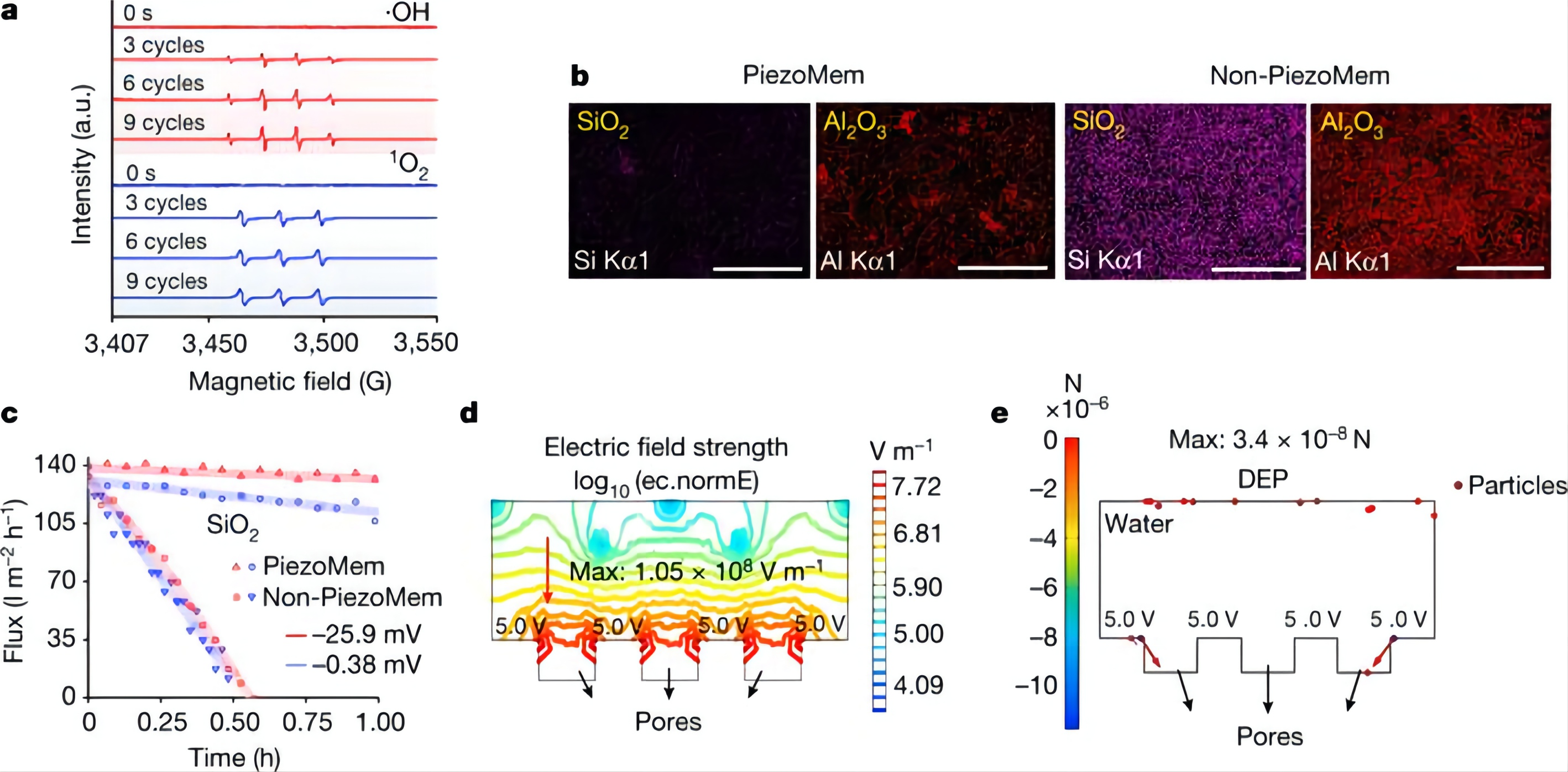 图4膜过程中产生的活性氧物种(a)和对无机颗粒物的抗污染效能(b-c),原位高强电场与基于介电泳抗膜污染过程的COMSOL模拟(d-e)