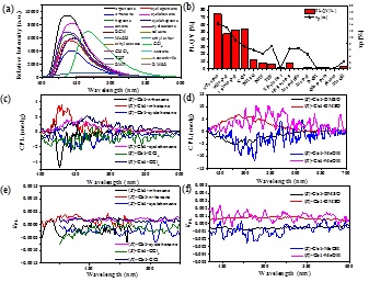 随着溶剂极性的逐渐增大,(R/S)-Cb1溶液的荧光量子产率(PLQY)不断衰减,发射峰逐渐红移,CPL发光强度增加,gPL因子逐渐增大。这一现象是由于分子内扭曲电荷转移(TICT)效应造成,使得(R/S)-Cb1可以应用于溶剂极性识别领域。