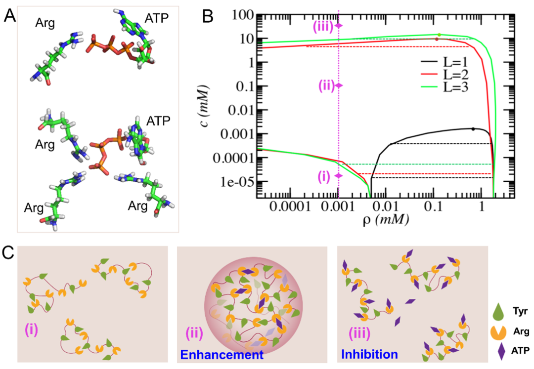 2. ATP对蛋白质相分离的影响。(A)蛋白质氨基酸与ATP间的微观作用模式;(B)存在ATP情况下的蛋白质体系相图;(CATP对蛋白质相分离影响的示意图。