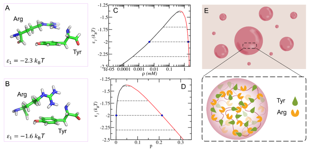 1. FUS蛋白的相分离机制。(A-B)蛋白质氨基酸间的微观作用模式;(C-D)纯FUS蛋白质体系相图;(E)蛋白质凝聚体内部网络结构示意图。