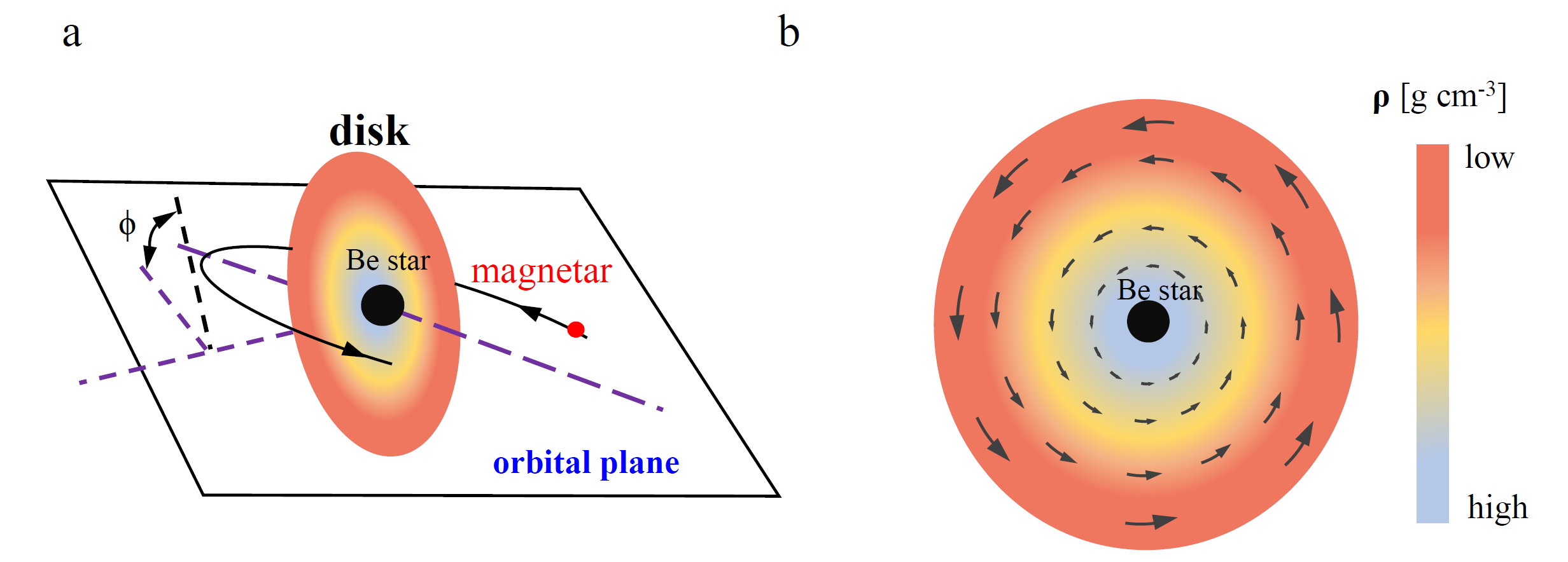 1. a)磁星和Be星组成的双星系统。(bBe盘的磁场和密度分布。