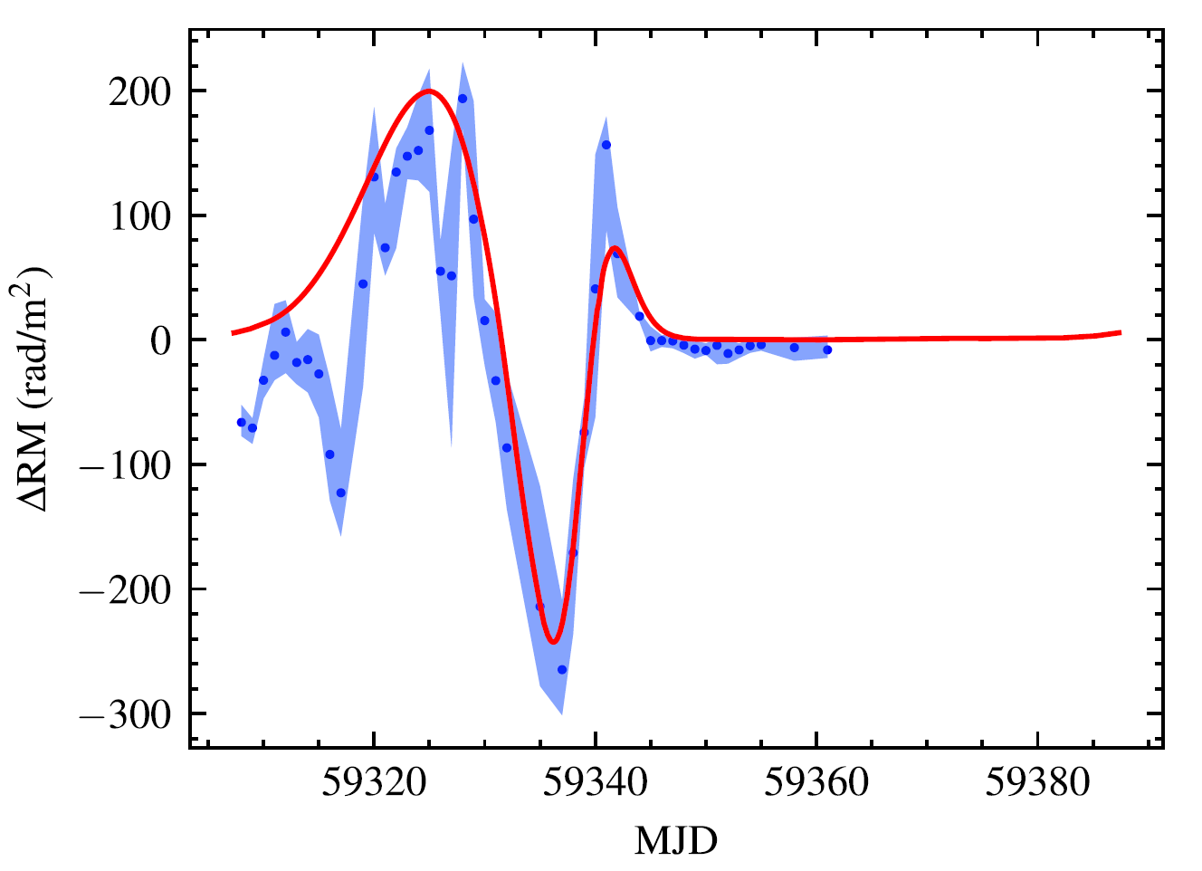 2. 观测的法拉第旋转量演化(蓝色区域)和模型拟合(红色线)。