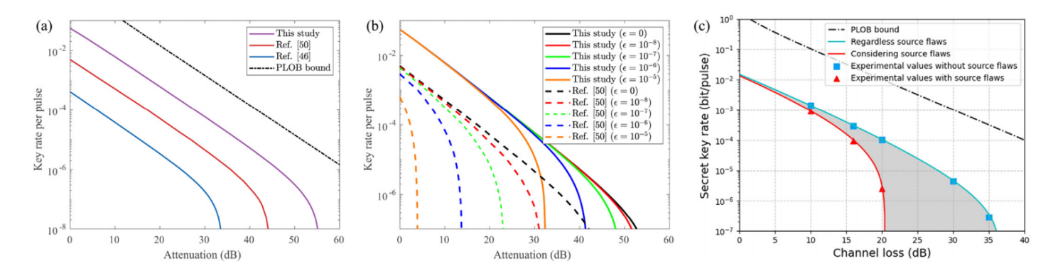 模拟结果如图二(a)和(b)所示,在无边信道攻击和有边信道攻击情况下,该协议相较之前协议,码率都有指数量级的提升。实验结果如图二(c)所示,考虑源不完美情况下,在10 dB(约50千米光纤)的信道传输损耗下,协议能够实现91 kbps的安全密钥率(满足语音通话等一次一密加密需求);在20 dB的信道传输损耗下,协议能够实现253bps的安全密钥率。在源完美情况下,则可在超过35 dB衰减的信道中成码。与其他允许源不完美的协议相比,该研究在安全密钥率和传输距离方面都有了显著提高。总的来说,该工作首次实验实现了基于参考技术表征源不完美性参数的量子密钥分发协议,证明了该方法的实际可行性。即使同时考虑光源不完美和抵御所有探测器端攻击,四相位测量设备无关量子密钥分发也可以在城域范围内迈向实际应用,显示出了其应用于实际量子通信网络部署的潜力。未来的工作还需要在实验中使用远距离锁频锁相技术解决Sagnac环的缺点,同时需要更细致地表征各种偏差参数。