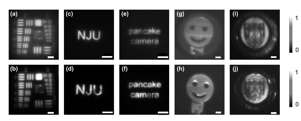 图5 (a)(c)(e)(g)(i)不同照明方式下不同物体的pancake超构透镜的成像结果。(b)(d)(f)(h)(j)不同照明方式下不同物体的普通超构透镜的成像结果。