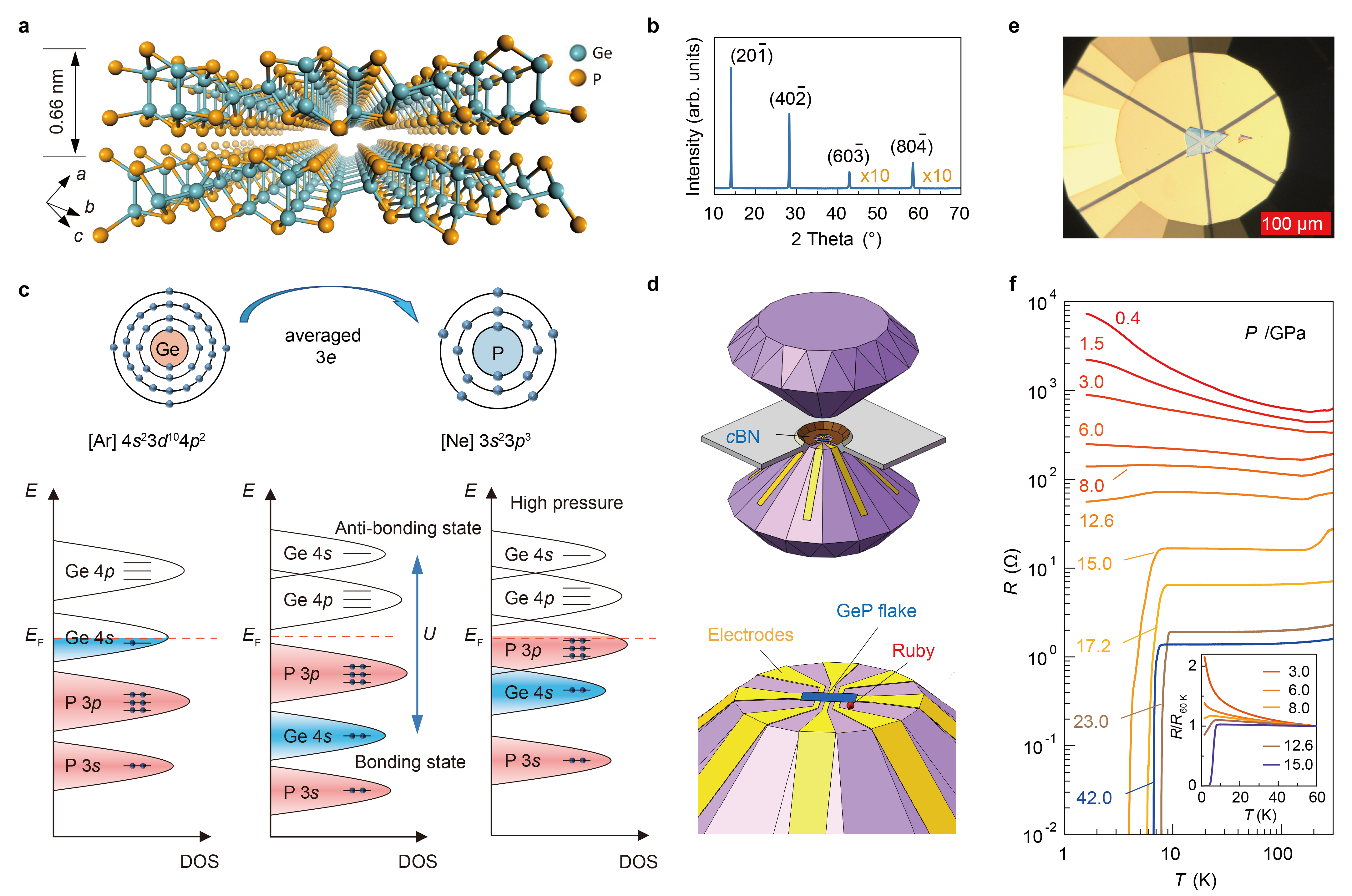 图1. 层状范德华材料GeP的晶体结构、及压力调控的价态跳变的轨道电子填充示意图和绝缘体-超导体转变。(a)晶体结构示意图。(b)X射线衍射(XRD)图谱。(c)Ge和P原子的电子构型和电子填充态密度(DOS)的示意图。(d)DAC高压电输运测量装置示意图。(e)金刚石砧面上GeP样品与金属电极的光学照片。(f)GeP在不同压力下电阻与温度的依赖关系。