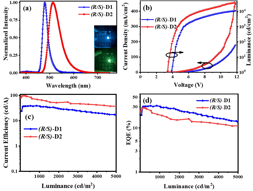 有机发光二极管(OLED)在现代生活中得到了广泛应用,而通过圆偏振发光(CPL)可以实现下一代圆偏振OLED(CP-OLED)和3D显示。高性能CP-OLED具有直接产生可调谐发射的CPL、简单的器件结构和高效率的优点,使其成为3D显示最可行的策略之一。在过去几年中,手性荧光材料包括聚合物和小分子、手性磷光金属配合物和手性热激活延迟荧光(TADF)材料都被应用于CP-OLED中。由于单重态(S1)和三重态(T1)激子都可以通过反向系统间交叉(RISC)过程获得利用,器件具有较高的性能,而无需贵金属的特点,手性TADF材料备受关注。然而,传统手性TADF材料的发射光谱较宽(FWHM > 60 nm),使得实现超纯彩色发射变得困难。