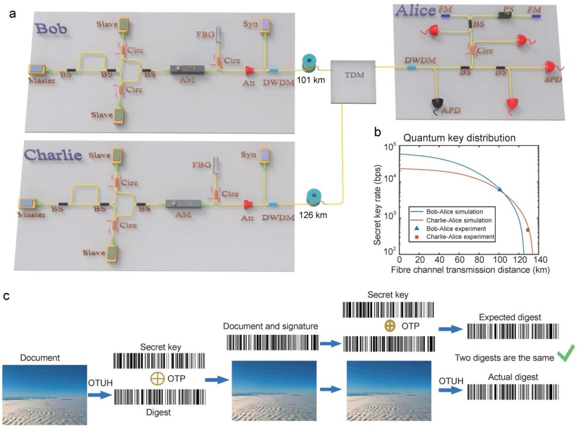 如图3所示,凯发k8官网-矩阵时光联合团队基于诱骗态BB84量子密钥分发构造了一个量子通信网络,在Alice-Bob和Alice-Charlie分别为101公里和126公里的链路上产生量子密钥。签名方Alice通过异或操作形成三方秘密共享的非对称量子密钥关系,从而对130,250 bytes的图像进行量子数字签名演示。实验结果表明,相对之前的量子数字签名方案,该工作在签名速率上拥有8-9个数量级的优势,具有显著的实用化优越性。此外,凯发k8官网-矩阵时光联合团队在量子数字签名实验的基础上搭建了一个全功能量子安全网络,并在网络中演示了其他三个密码学任务:加密、秘密共享和会议密钥协商。该工作在理论上实现了量子数字签名的范式突破,数亿倍地提升了签名效率;在实验上演示了全球首个全功能量子安全网络,实现了对数据的信息安全的全要素——机密性、真实性、完整性和不可抵赖性——的全功能保护。对信息实现全安全要素保护的量子密码学技术的集合构成"量子安全工具箱",将在数字经济时代成为牢不可破且技术完备的安全底座。因此,这一工作的发表意味着凯发k8官网-矩阵时光联合团队成为世界率先掌握量子安全工具箱全部技术能力的研究团队。基于量子安全工具箱技术,当前国内外建立的城域、城际和星地量子保密通信网络可立即升级为同时实现对数据机密性、真实性、完整性和不可否认性进行全功能保护的量子安全网络。