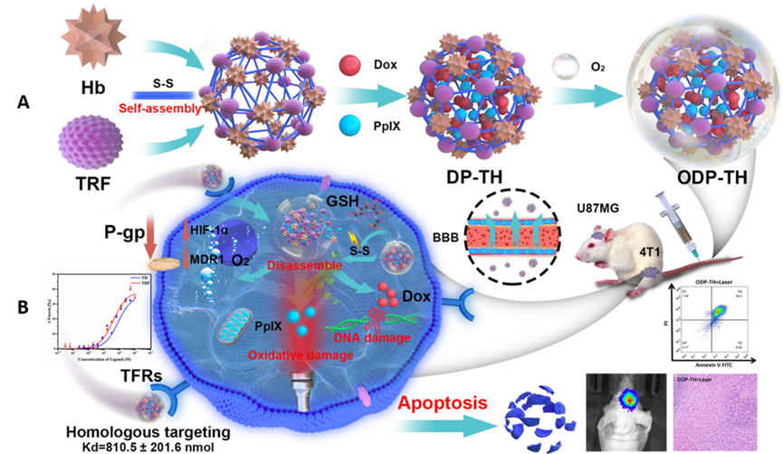 将转铁蛋白和血红蛋白通过二硫键重构的自组装方式包载化疗药物Dox和光敏剂PpIX,体外整合氧气构建出既具有携氧能力又具有原位脑胶质瘤精准靶向性功能的杂合蛋白纳米载药平台ODP-TH。一方面,该转铁蛋白药物载体能特异性识别并结合肿瘤及脑内皮细胞细胞表面过表达的转铁蛋白受体,经转铁蛋白受体介导跨过血脑屏障,选择性地富集到中枢神经肿瘤细胞处,在低氧高GSH浓度的肿瘤微环境中将包封的药物和运载的氧气快速、持续释放。另一方面研究供氧型转铁蛋白介导的多功能纳米载药系统对了解肿瘤微环境缺氧的而导致的疾病机制,建立成体系的生物安全性好、靶向性强、响应迅速及协同抗肿瘤的供氧型药物纳米递送平台方法,解决由于缺氧引起的多种氧气相关基因表达紊乱(MDR1、HIF-1α和P-gp),减少化疗药物外排,缓解化疗中常见的耐药不良现象有着深远现实的应用价值。