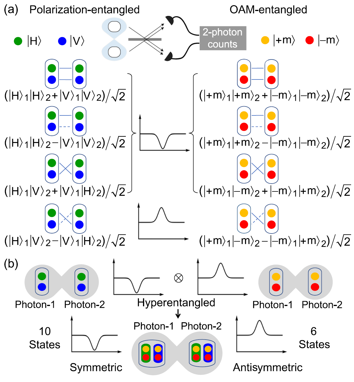 图1. 双光子干涉聚束和反聚束现象。(a) 4个单自由度Bell态中有3个对称态和1个反对称态;(b) 16个偏振和轨道角动量超纠缠Bell态有10个对称态和6个反对称态。