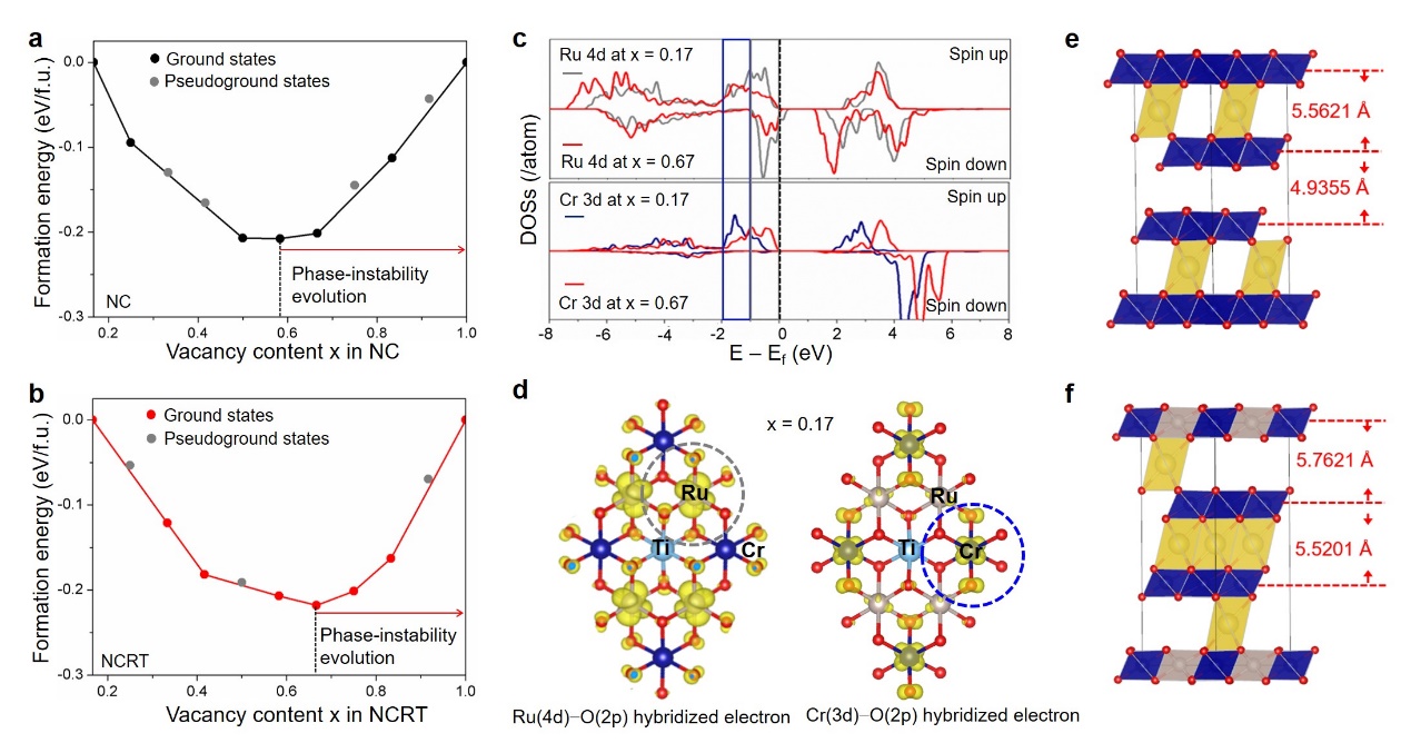 图1. NC中钠空层的形成和NCRT中钠空层抑制的理论计算。(a)NC和(b)NCRT在0.17 ≤ x ≤ 1.0钠空位范围内形成能与空位含量(x)的函数关系。黑色(NC)和红色(NCRT)圆点代表基态,灰色圆点代表赝基态。(c)NCRT中过渡金属混合层中,x = 0.17和x = 0.67时,Ru-4d电子和Cr-3d电子的PDOS图。(d)基于图c获取的在-1.0 ≤ E - Ef ≤ 0和-2.0 ≤ E - Ef ≤ -1.0区间电子空间分布。钠空位为0.67时(e)NC和(f)NCRT的原子示意图和相应的两过渡金属层间的距离。其中NC中两过渡金属层间距为5.5621和4.9355 ?,NCRT中两过渡金属层间距为5.7621和5.5201 ?。