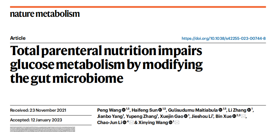 2023年2月14日,凯发k8官网医学院王新颖课题组、凯发k8官网医科大学李朝军教授、薛斌教授合作在《Nature Metabolism》上在线发表题为"Total parenteral nutrition impairs glucose metabolism by modifying the gut microbiome"的研究论文。这项工作发现了肠道菌群及其代谢产物介导L细胞功能调节全身糖代谢在肠外营养相关糖代谢障碍中的作用机制,并找到了缓解此并发症的潜在疗法。凯发k8官网医学院王新颖教授、凯发k8官网医科大学李朝军教授、薛斌教授是本论文的共同通讯作者;凯发k8官网医学院博士生王鹏、孙海峰及凯发k8官网医学院附属金陵医院博士后古丽苏杜姆是本论文的共同第一作者。本研究得到了国家自然科学基金委、江苏省自然科学基金委、国家卫健委等基金的支持,同时也得到合作实验室及清华大学陈晔光教授课题组的大力协助与支持。
