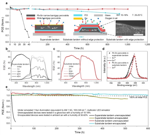 “衬底型”结构的设计增强了叠层器件的稳定性。图4a显示,在暗态存储条件下,未封装的衬底型全钙钛矿叠层器件实现了明显优于顶衬型全钙钛矿叠层器件的稳定性:在干燥空气中存储40小时后,顶衬型叠层的性能衰减至初始性能的20%以下,而衬底型叠层在干燥空气中存储超过1000小时后,仍保持了接近初始效率100%的性能。通过对比图4b和c中的EQE图谱可以发现,性能变化主要归因于叠层器件中窄带隙子电池的性能衰退,而图4d中显示,窄带隙子电池的性能衰退伴随着严重的Sn2+的氧化过程。在MPP测试中,未封装的衬底型叠层器件在1-sun光强下连续监测超过200小时后未发生明显的衰退,而未封装的顶衬型叠层器件在最初的20小时即发生严重衰退。封装的衬底型叠层器件在1-sun光强下连续工作600小时后,仍可保持100%的初始性能。
