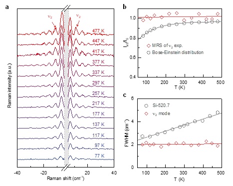 在光学拉曼光谱中,粒子振动态布居数决定了anti-Stokes和Stokes信号的强度比(IaS/IS),并遵从玻色-爱因斯坦分布。相比于光学拉曼过程,MRS具有显著的无热噪声特征,这表现在:(1)IaS/IS值在整个实验温度区间(77-477 K)始终接近常数1;(2)半峰宽不随温度升高而展宽。这一特点使MRS在振动测量具有独特优势(图3)。研究团队还通过一系列复合振子实验验证了MRS的长程传播行为和隐藏界面探测能力。