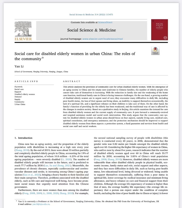 近日,我校政府管理学院李岩教授以独立作者于健康社会学国际期刊Social Science & medicine 发表了题为Social care for disabled elderly women in urban China: the roles of the community的研究论文(论文链接:https://doi.org/10.1016/j.socscimed.2022.115473 )。