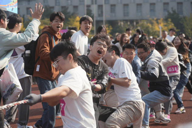 在研究生师生拔河赛中,来自31个学院的16队伍在8个比赛区域内展开了精彩的比拼。拔河裁判员一声哨响,比赛正式开始,双方队员立刻进入状态,肌肉紧绷,脚步稳健,每个人都在用尽全力。观众们的加油声此起彼伏,为各自的队伍助威。在紧张激烈的对抗中,有的队伍凭借默契的配合和强大的力量,逐渐占据了优势;而有的队伍则在逆境中展现出不屈不挠的精神,即使暂时落后,也绝不放弃。