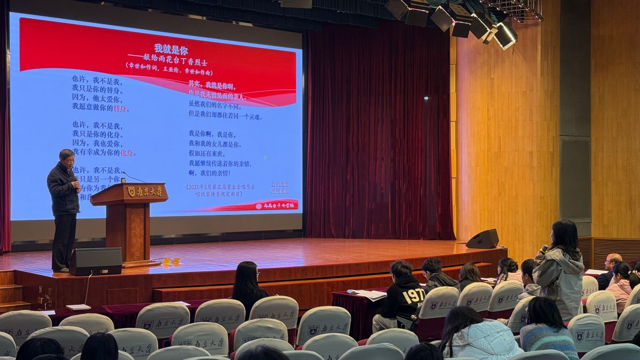 本次课堂聚焦雨花英烈故事,其中丁香烈士的生平尤为感人。她自幼被遗弃后幸得收养,在大学期间结识进步青年,毅然走上革命道路,最终在狱中坚守信仰,英勇就义。章世和展示了多首原创歌曲,包括讲述丁香烈士故事的作品,从创作理念到与艺术家的合作修改,再到现场合唱队的演唱及同学的心得分享,充分展现了歌曲的感染力与教育价值。曹顺标烈士事迹同样震撼人心,他与温济泽狱中经历尽显高尚品格,其爱情遗憾被文艺工作者谱写成歌,动人的旋律与深刻的内涵引发了同学们强烈的情感共鸣,让同学们对爱情与家国情怀有了更深刻的理解。李耘生烈士为保护国家机密,在狱中与年幼的儿子忍痛“相认”的场景让在场的师生潸然泪下,相关歌曲将这份父子亲情与革命大义生动而深刻地展现了出来,令人无不为之动容,心生敬意。