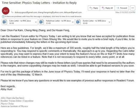 国际物理核心期刊《今日物理》(Physics Today)杂志于4月期刊首篇,刊登编辑部精选的部分读者对发表于2024年12月《今日物理》封面文章“吴健雄在粒子物理方面的开创性实验”的评价及作者的回复,并以:“吴健雄专题文章的澄清说明”为题。