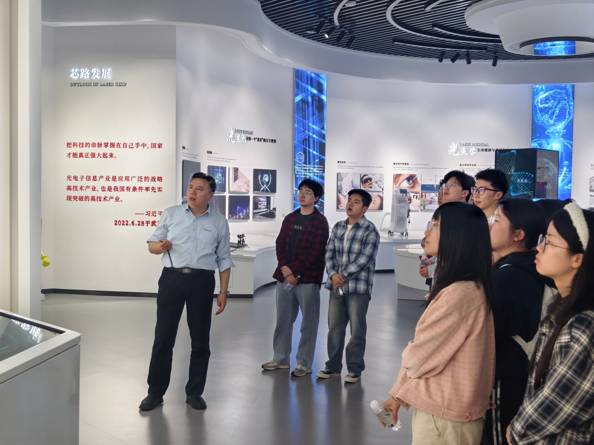 座谈会后,师生一行参观了长光华芯洁净展厅。通过李顺峰的专业讲解,同学们近距离了解了半导体激光器的研发流程与前沿成果,深刻体会到“科技自立自强”的战略意义。