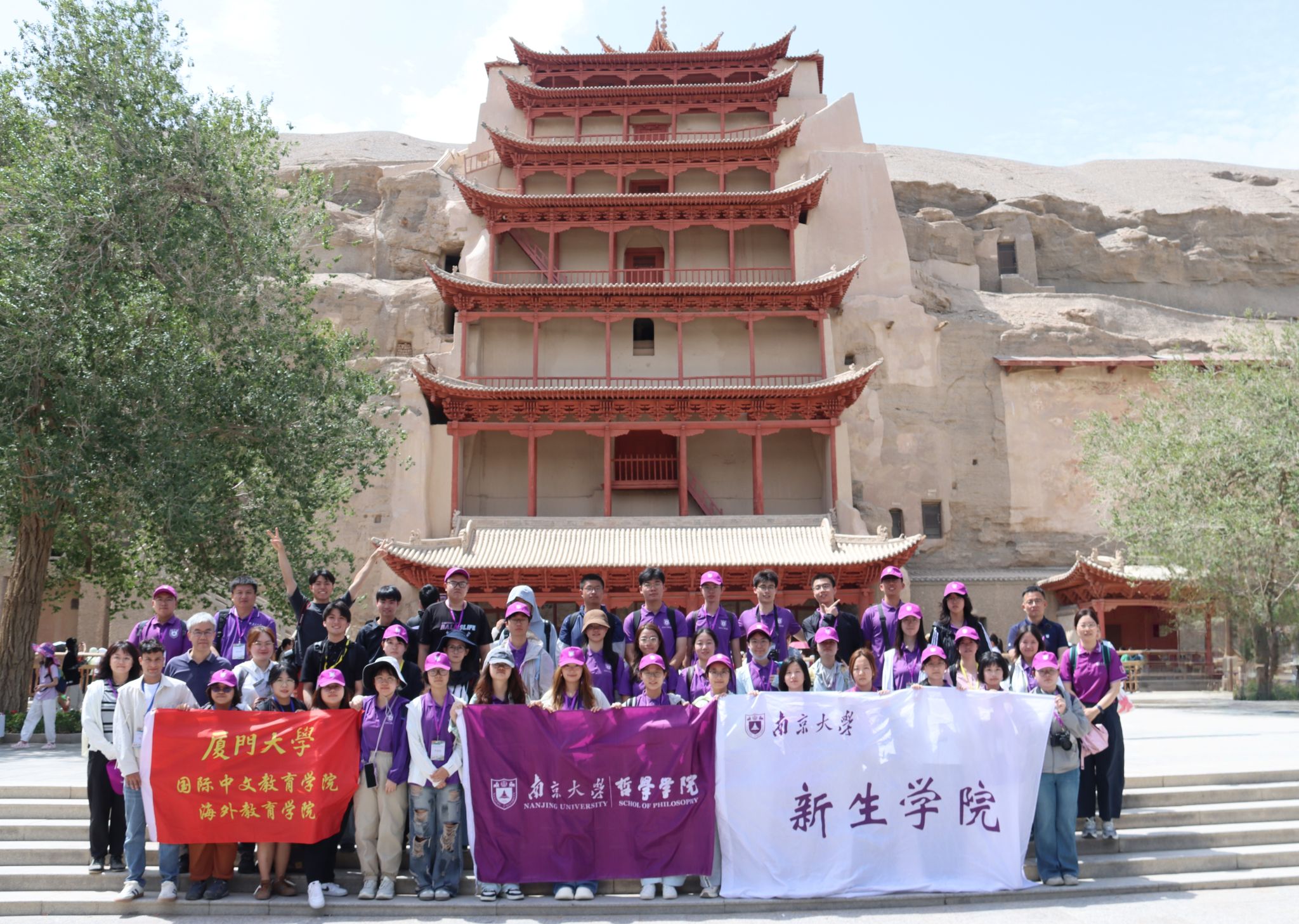 敦煌是东西文明汇通之地。习近平总书记指出,把莫高窟保护好,把敦煌文化传承好,是中华民族为世界文明进步应负的责任。2025年8月14日至19日,在哲学学院邵佳德副院长、胡永辉副教授、赵立助理研究员和新生学院教师周围、邓泽燕的带领下,凯发k8官网哲学、新闻传播学、外语、工科试验班等专业的29名本科生和东京大学文学部、工学部的5名研究生以及厦门大学国际中文教育学院的5名外籍研究生奔赴敦煌,在实地科考中深入理解敦煌文化与中华文明的历史,思考体悟中华优秀传统文化创造性转化、创新性发展的新使命,积极探寻全球化背景下助力文明交流互鉴的新路径。本次活动也是凯发k8官网2025年学生暑期社会实践“青春奋进”校级特别专项之一。